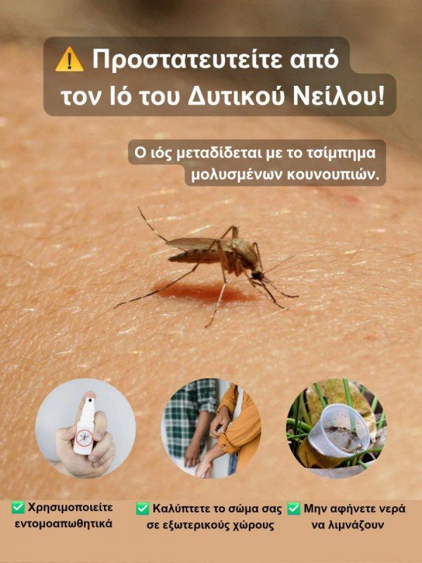 Ο Εθνικός Οργανισμός Δημόσιας Υγείας (ΕΟΔΥ) συνιστά τη λήψη προληπτικών μέτρων κατά των κουνουπιών, με στόχο τον περιορισμό της πιθανότητας λοίμωξης από τον ιό του Δυτικού Νείλου.